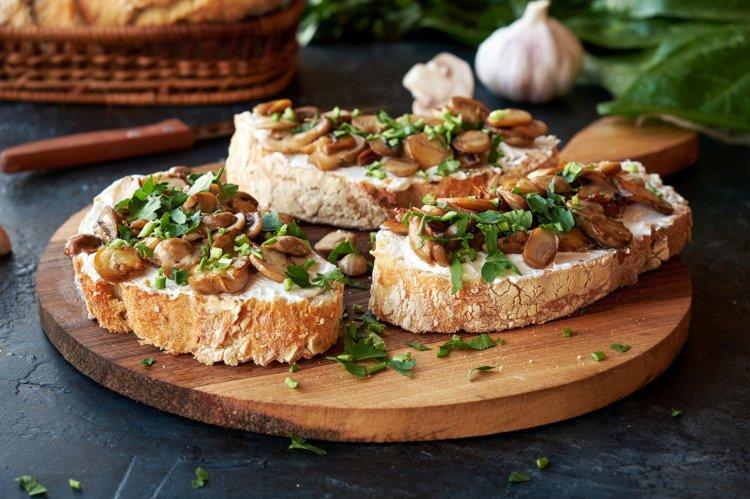 Тебе понадобятся: 1 багет или чиабатта, 100 г творожного сыра, 150 г шампиньонов, 1 зубчик чеснока, соль, молотый черный перец.