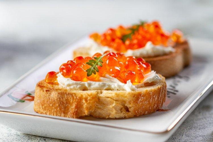 Приготовление: Нарежь и обжарь ломтики багета. Смешай мягкое сливочное масло, 1-2 ложки лимонного сока и цедру по вкусу, и взбей до пышности. Выложи намазку на багет, укрась красной икрой и добавь немного зелени.