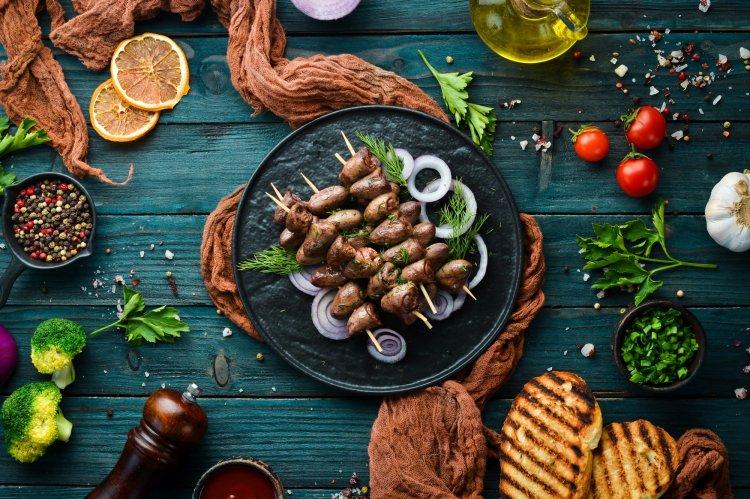 Приготовление: Произвольно нарежь лук и смешай его с куриными сердечками, солью и специями. Добавь горчицу и майонез, хорошенько перемешай заготовку и отправь мариноваться на 1 час в холодильник. После чего нанижи сердечки с луком на шпажки и запекай 20 минут в аэрогриле при 190-200 градусах.