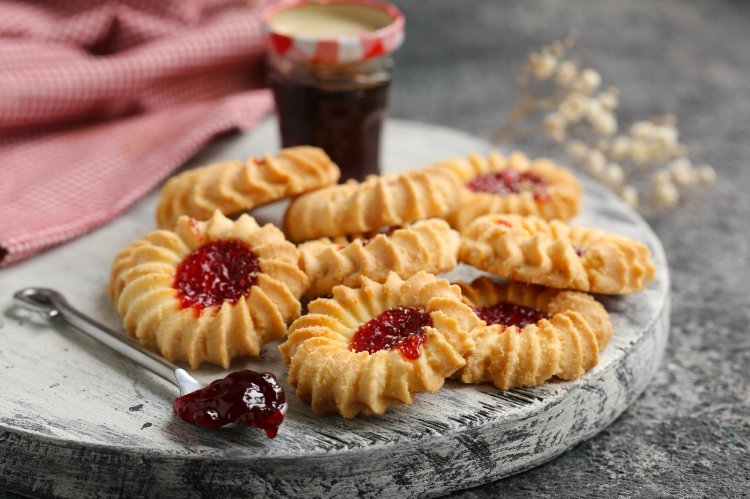 Приготовление: Миксером взбей мягкий маргарин с сахаром, вбей яйца и перемешай. Добавь муку с разрыхлителем, вымеси тесто и с помощью кондитерского мешка выложи его на пергамент. Сделай небольшое углубление в центре каждой заготовки и добавь туда немного варенья. Выпекай печенье 12-15 минут в духовке при 180 градусах.