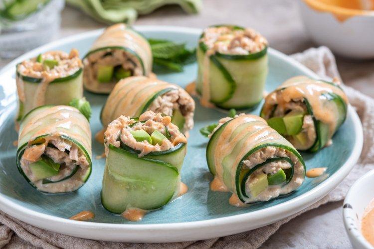 Приготовление: Нарежь огурцы тонкими и длинными слайсами. Вилкой разомни консервированный тунец, мелко наруби зеленый лук и смешай все это с творожным сыром. Добавь соль и молотый черный перец в начинку, а затем заверни ее рулетиками в слайсы огурцов.