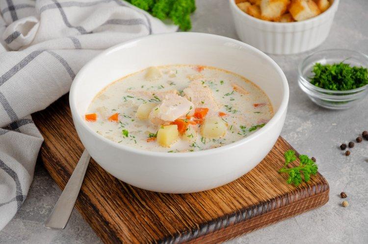 Тебе понадобятся: 250 г кеты, 1 л рыбного бульона, 3 картофелины, 2 моркови, 100 г лука-порея, 1-2 стебля сельдерея, 200 мл жирных сливок, 20 г сливочного масла, 30 г муки, укроп, соль, специи.